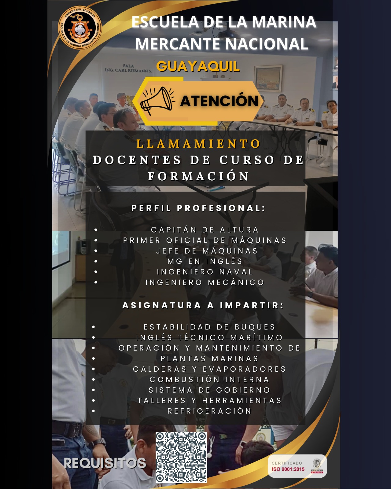 La Escuela de la Marina Mercante hace un llamado a la ciudadanía Ecuatoriana a postularse al llamamiento de aspirantes a cadetes Electrotécnicos …